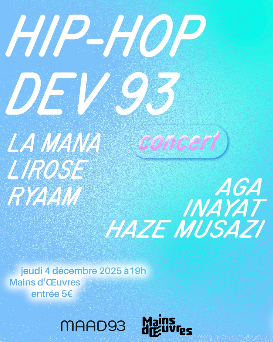 Le MAAD 93 et Mains d'Œuvres vous invitent à découvrir le jeudi 4 décembre 2025 les six artistes accompagné·es depuis janvier 2025 dans le cadre du dispositif d'accompagnement HIP-HOP DEV 93 porté par le MAAD 93.